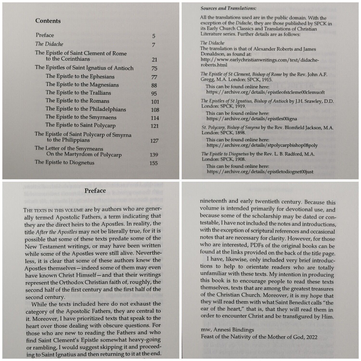 The book contains texts from the Apostolic Fathers, the earliest Christian writers after the Apostles (see the photos for details). It is digitally printed on 90 gsm Munken Pure paper in a 9.5 point font. With the exception of the Didache, the public domain translations used are those published by SPCK in its Early Church Classics and Translations of Christian Literature series (again, see the photos for further details).