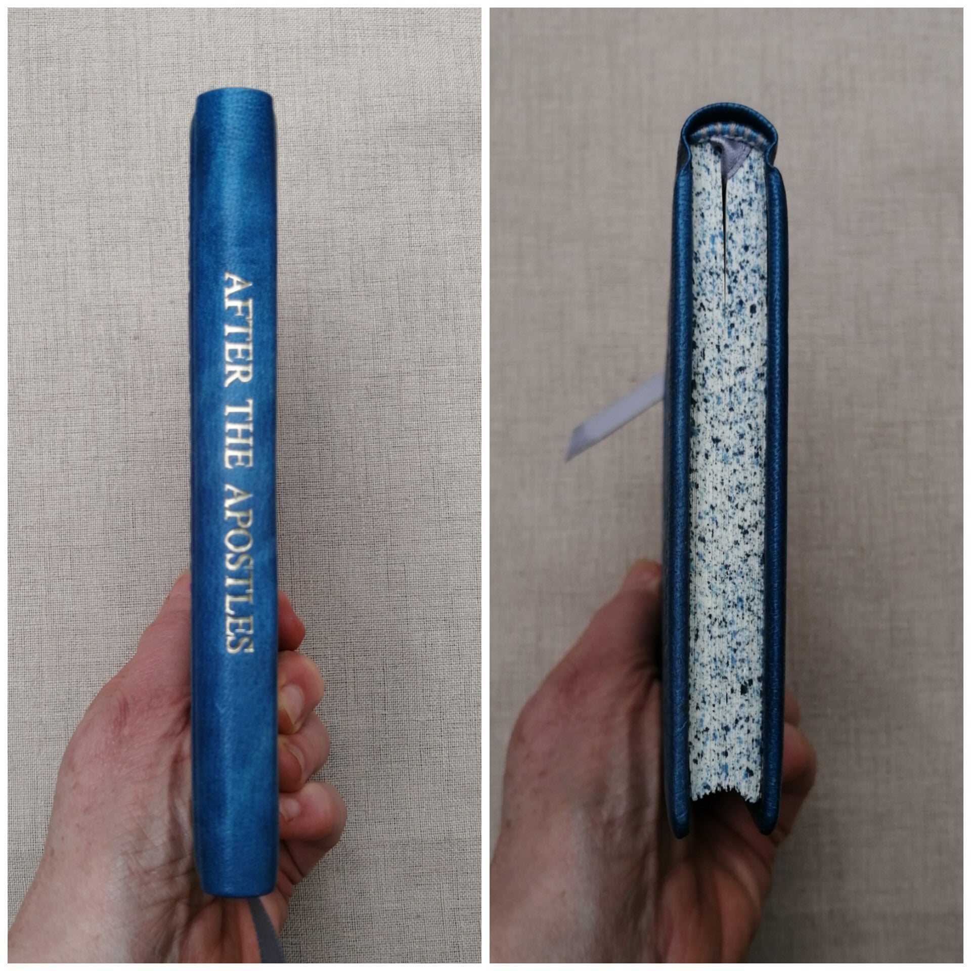 This is a hand-sized (A6) book that has been hand-stitched and case bound in veg-tanned goatskin that I have dyed and tooled myself. It has hand-stitched headbands, made printed marbled endpages that have been waxed with beeswax, one ribbon marker, speckled edges, and "AFTER THE APOSTLES" gold foiled on the spine.