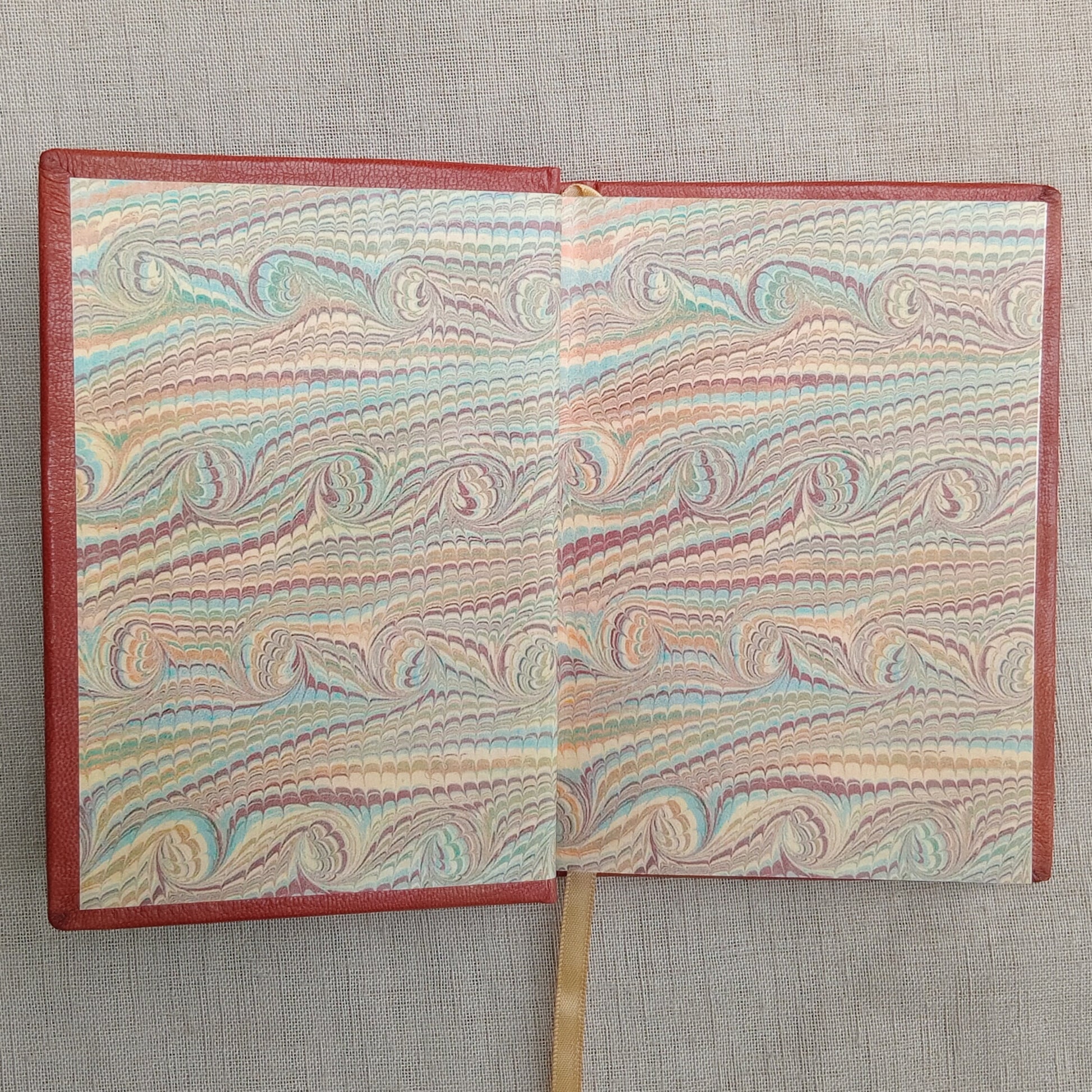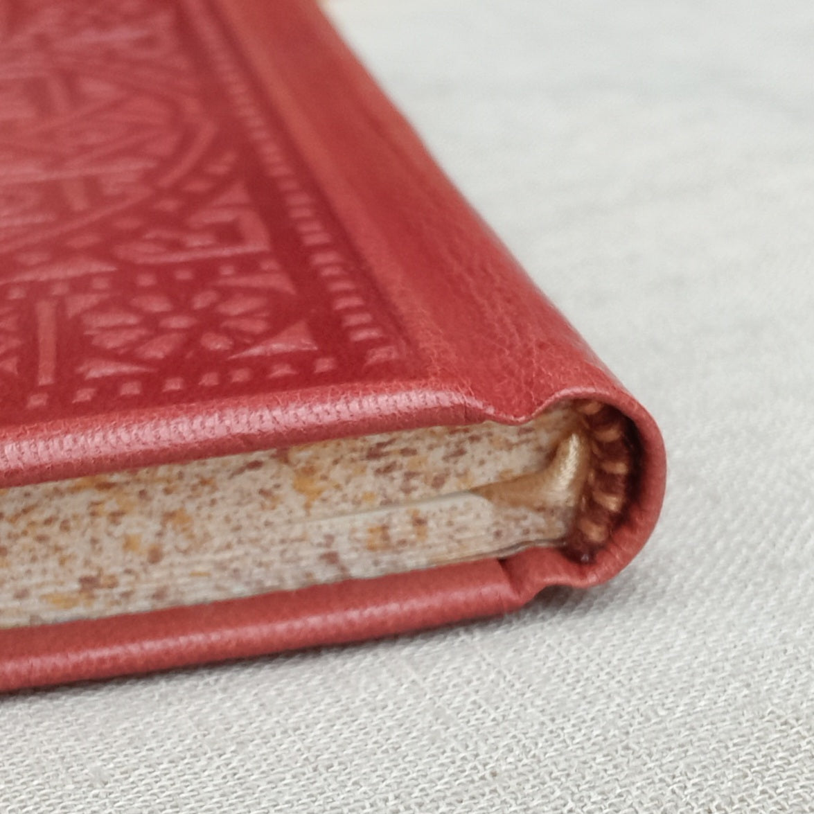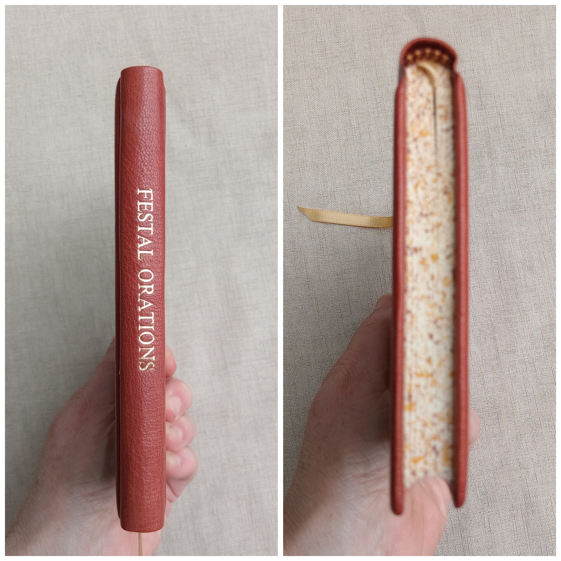 This is a hand-sized (A6) book that has been hand-stitched and case bound in veg-tanned goatskin that I have dyed and tooled myself. It has hand-stitched headbands, made printed marbled endpages that have been waxed with beeswax, one ribbon marker, speckled edges, and "FESTAL ORATIONS" gold foiled on the spine.
