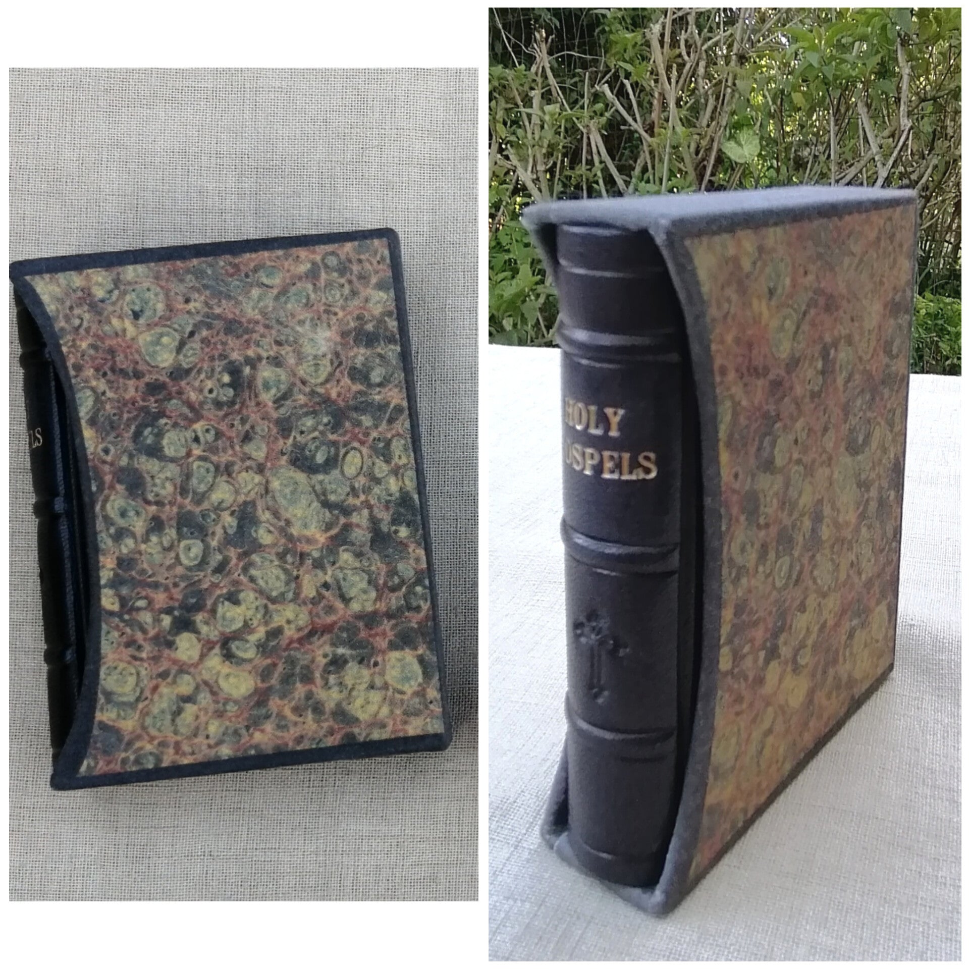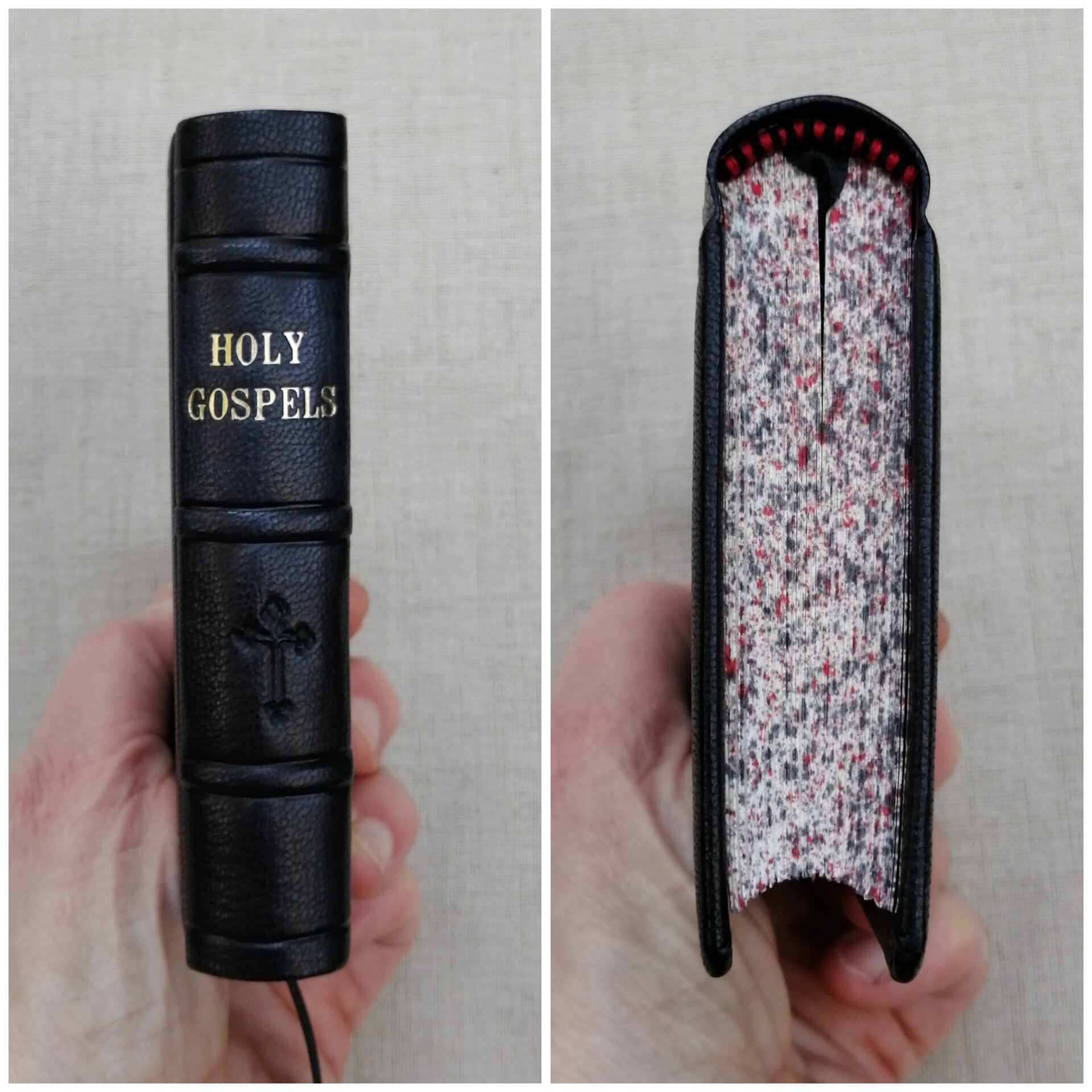 This is a small (A7-sized) book of the four Christian Gospels, which has been hand-stitched and case bound in veg-tanned calfskin that I have dyed and tooled myself. The book has hand-stitched headbands, made printed marbled endpages that have been waxed with beeswax, one ribbon marker, speckled edges, and "HOLY GOSPELS" gold foiled on the spine.