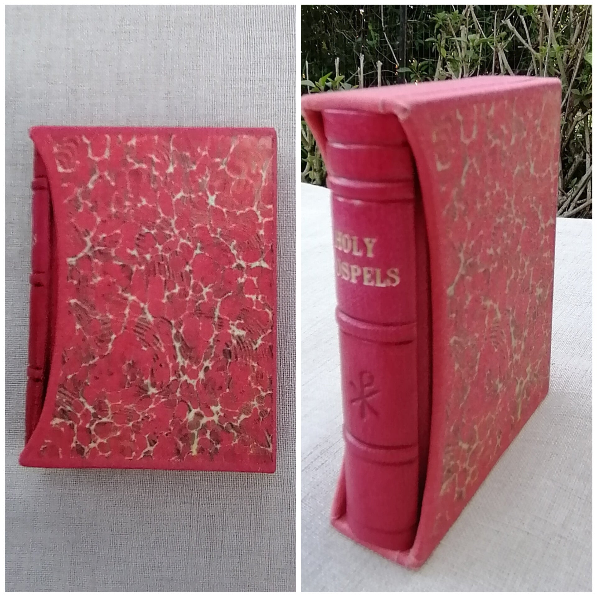 This is a small (A7-sized) book of the four Christian Gospels, which has been hand-stitched and case bound in veg-tanned calfskin that I have dyed and tooled myself. The book has hand-stitched headbands, made printed marbled endpages that have been waxed with beeswax, one ribbon marker, speckled edges, and "HOLY GOSPELS" gold foiled on the spine.